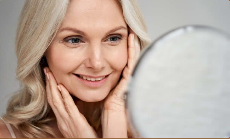 З віком шкіра втрачає пружність, з’являються зморшки, опускаються кутики обличчя, контур стає менш чітким.